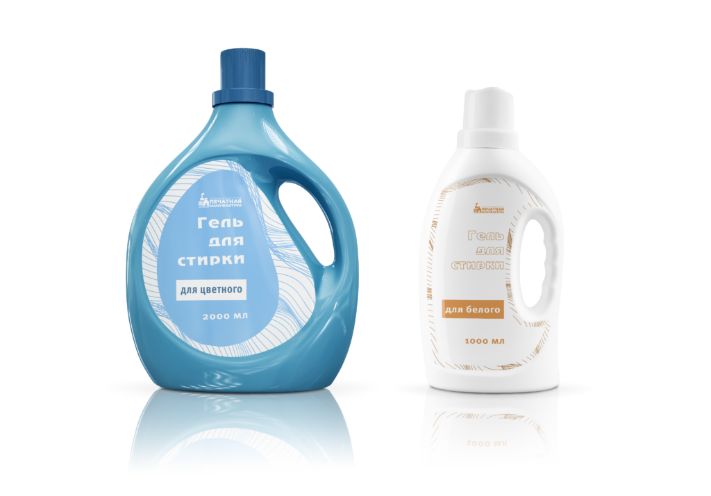 Этикетки для стиральных порошков и гелей для стирки обязательно должны быть влагостойкими. В состав влагостойких этикеток из бумаги входят специальные смолы, которые не дают намокнуть этикетке, отталкивая воду от поверхности. Этикетки на пленке — являются износостойкими и влагостойким видом наклеек. Срок службы пленочных в несколько раз дольше, чем у бумажных аналогов. Можем печатать наклейки на пленке с применением УФ-красок. Так же популярным является изготовление и печать этикеток на прозрачной пленке.